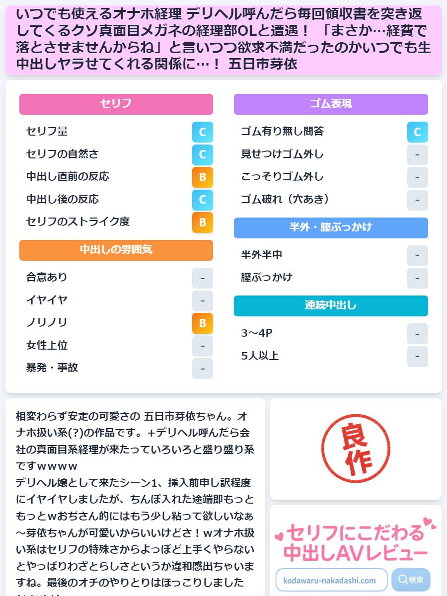 いつでも使えるオナホ経理 デリヘル呼んだら毎回領収書を突き返してくるクソ真面目メガネの経理部OLと遭遇! 「まさか…経費で落とさせませんからね」と言いつつ欲求不満だったのかいつでも生中出しヤラせてくれる関係に…! 五日市芽依